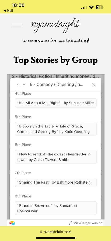 Thrilled one of my favourite fictional characters got me through to round 2 of the NYC Midnight 250 word micro-fiction challenge. The criteria were a comedy involving cheering and the word “necessary”. Round 2 was historical fiction, so I’m not holding my breath for that one, but for now, meet Marge, the oldest cheerleader in town.