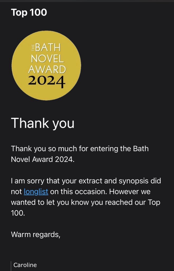 As some of you know, my writing this year has been focussed on a novel that is incredibly personal to me. I decided, by means of putting a rocket up my own arse, to enter it into the odd competition. However for various reasons, I’ve been struggling with it a lot of late. Then on Friday came the morale boost I so sorely needed: